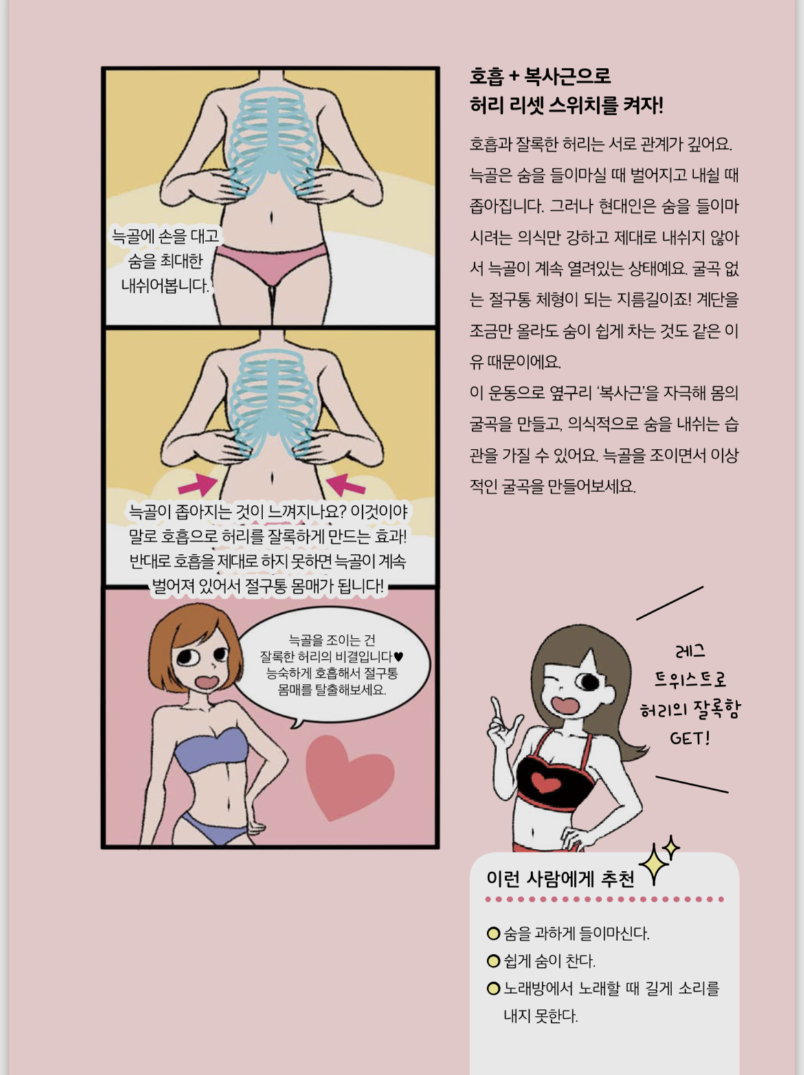 늘 늑골이 풀어진 채로 살아왔던 나는 처음에 도대체 그걸 어떻게 조이라는지 이해가 되지 않았다. 아니 뼈는 뼈잖아. 움직여지지 않는 딱딱한 것? 장기 다치지 말라고 갈비뼈가 그렇게 둥그렇게 공간 품은 모양으로 생겼는데 도대체 어떻게 조인다는 건가. 게다가 펴면 펴고 말면 마는 거지 늑골만 조이라는 것도 의아했다.