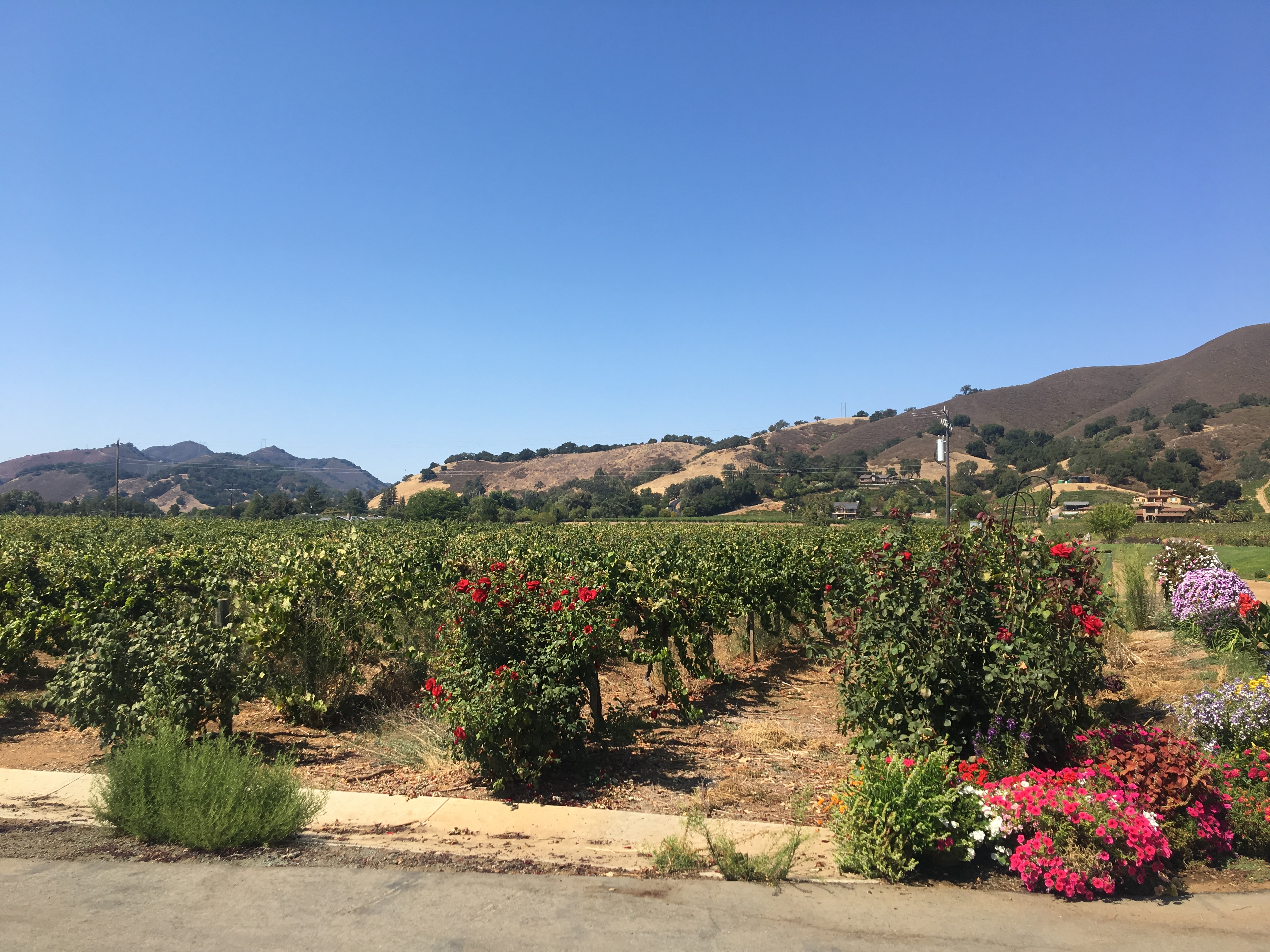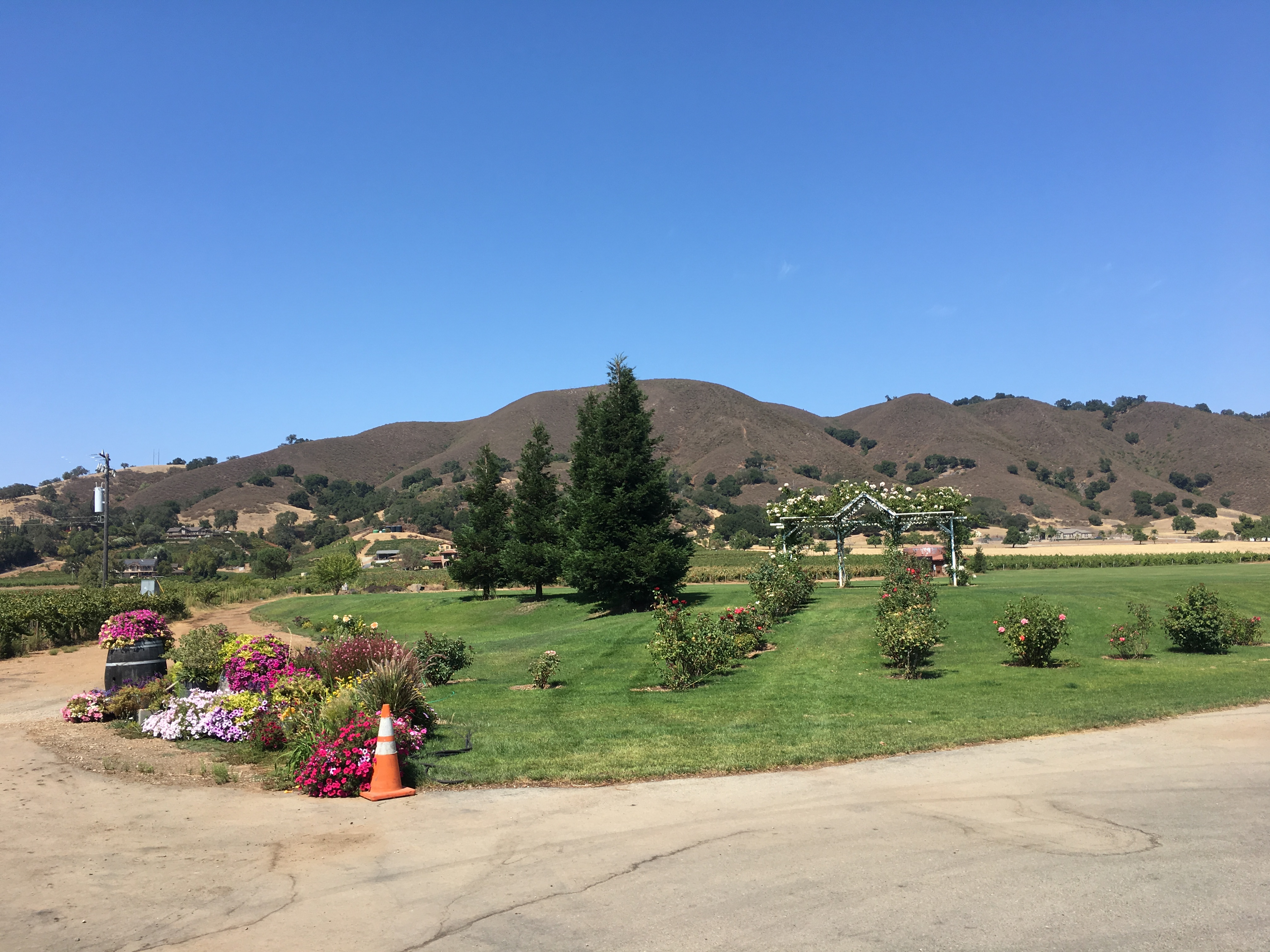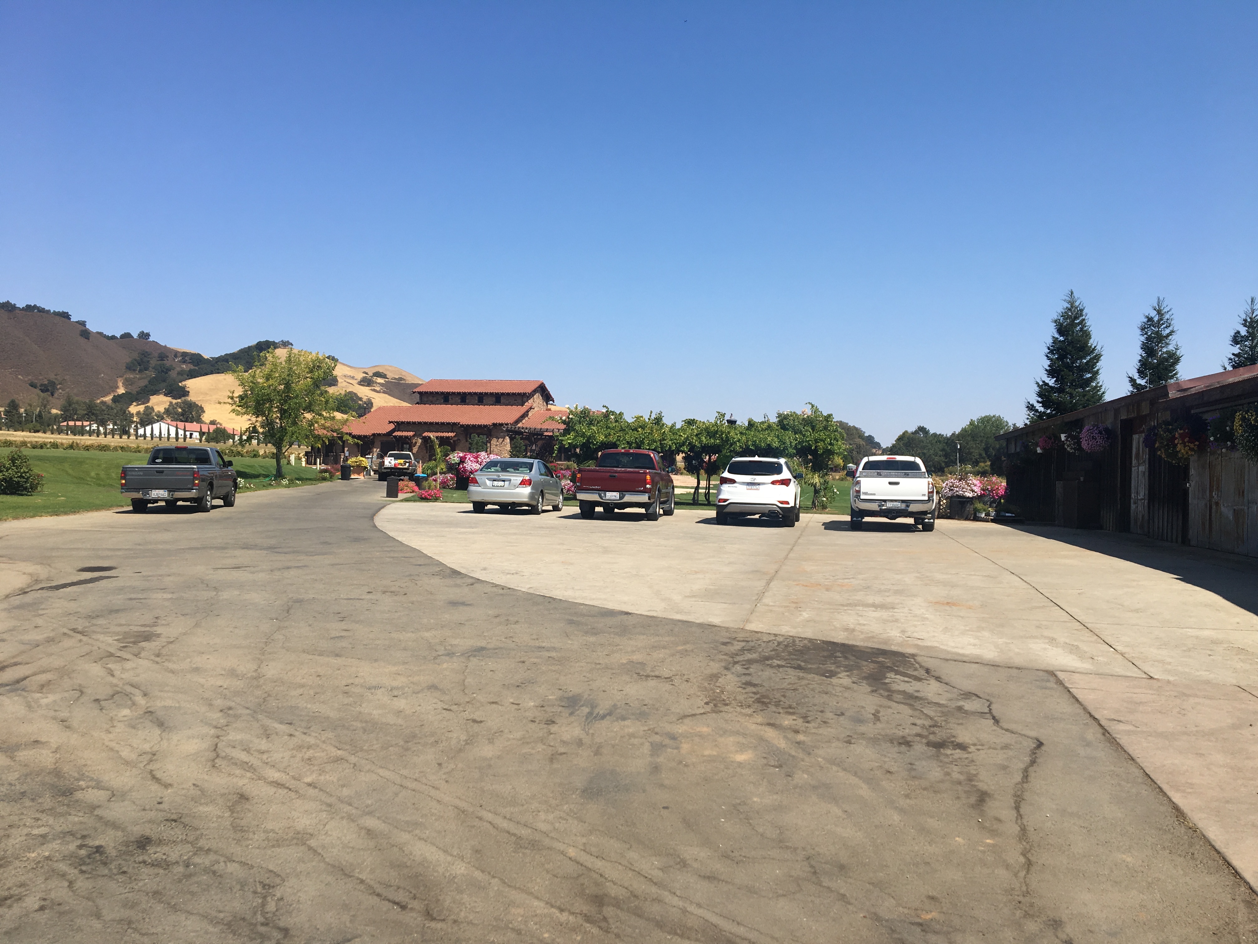 와이너리는 아울렛에서 멀지 않은 곳에 있었다. 차로 한 10여분 거리였던 것 같다. 고속도로를 빠져나와서 한적한 시골길을 달렸다. 아울렛과 프랜차이즈 식당들이 늘어선 대도로변을 조금만 벗어났을 뿐인데 풍경이 완전히 바뀌었다. 심지어 들고 있는 핸드폰도 신호가 약해지고 있었다. 5분정도 지나자 언덕길로 들어섰고 오른편으로 야트막한 연두색 작은 나무들의 잘 정비된 숲이 나타났다. 포도나무이다. 눈길이 가 닿는곳 끝까지 너른밭에 전부 포도나무로 가득찬 공간. 또다른 와이너리 간판이 빠르게 하나 지나갔다. 캘리포니아산 와인의 떼루아는 지금 이 태양의 열기, 온도, 습도, 땅을 일컫는 것이리라. 앞으로 미국 와인을 먹을때마다 이 열기를 떠올리게 될까.